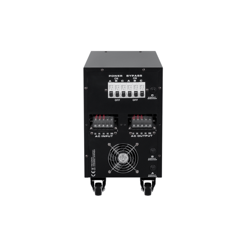 In modul trifazat, este important sa se mentina echilibrul intre faze. Stabilizatorul monitorizeaza si controleaza tensiunea pe fiecare faza pentru a asigura consistenta intre ele – va compensa o tensiune de intrare prea mare sau prea mica si va furniza tensiunea de iesire dupa stabilizare. Daca in acest mod una dintre faze nu functioneaza corespunzator sau nu este conectata, aparatul va activa protectia si nu va furniza tensiune la iesire, informand despre aceasta cu indicatorul „EROARE FAZA”.