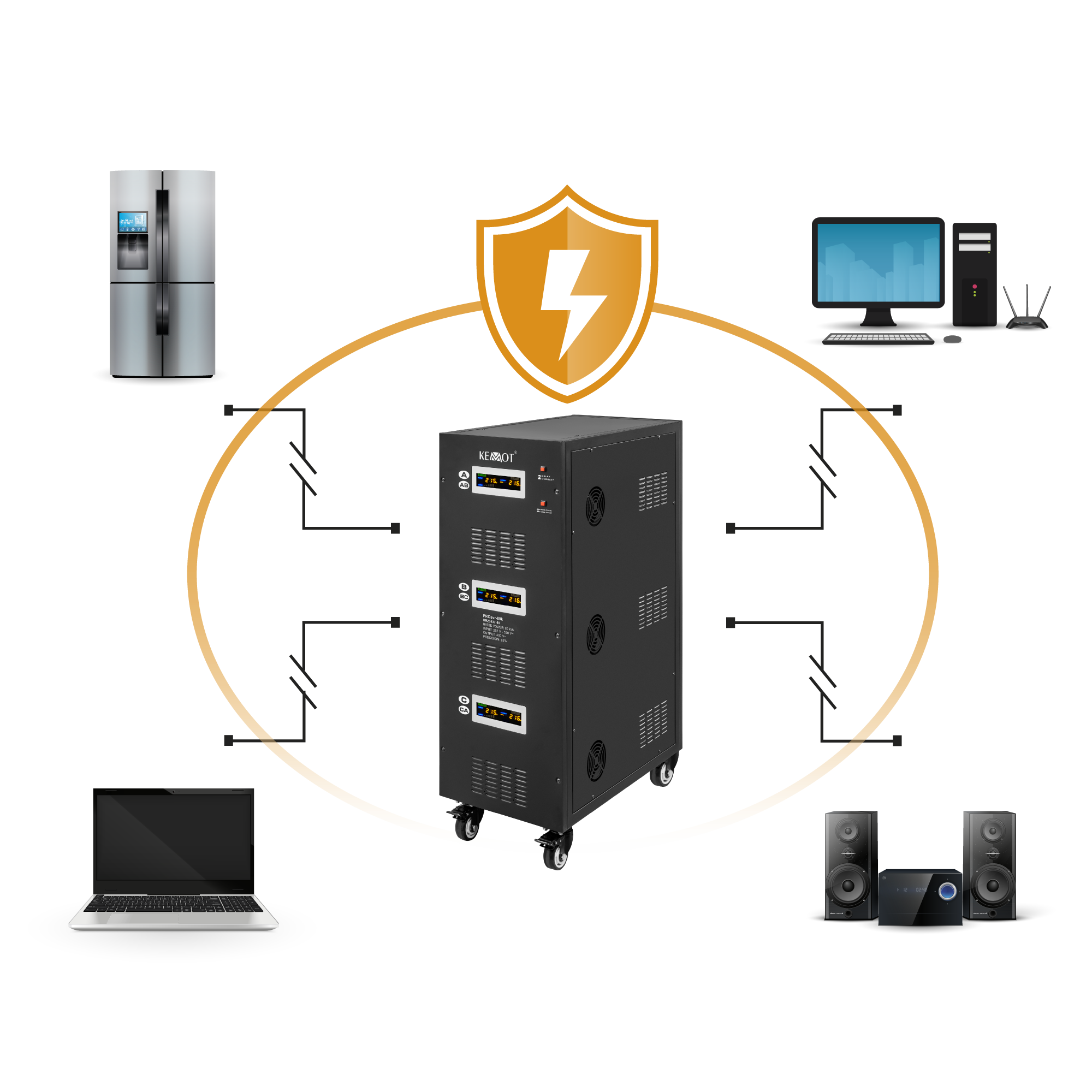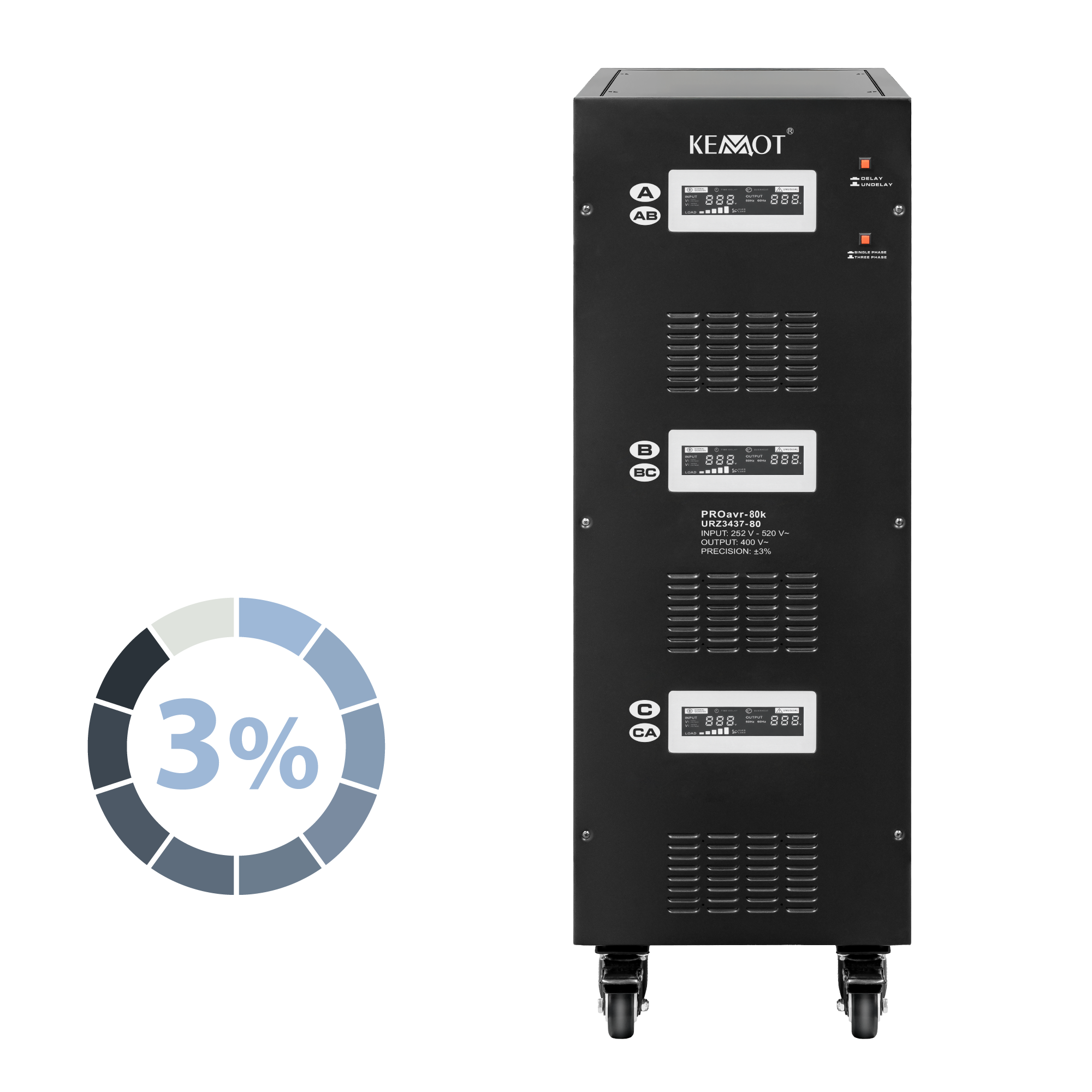 Stabilizatorul de tensiune KEMOT PROavr-80k mentine tensiunea cu o precizie ridicata de pana la 3%. O astfel de precizie ridicata de operare este rezultatul utilizarii tehnologiei bazate pe servo.