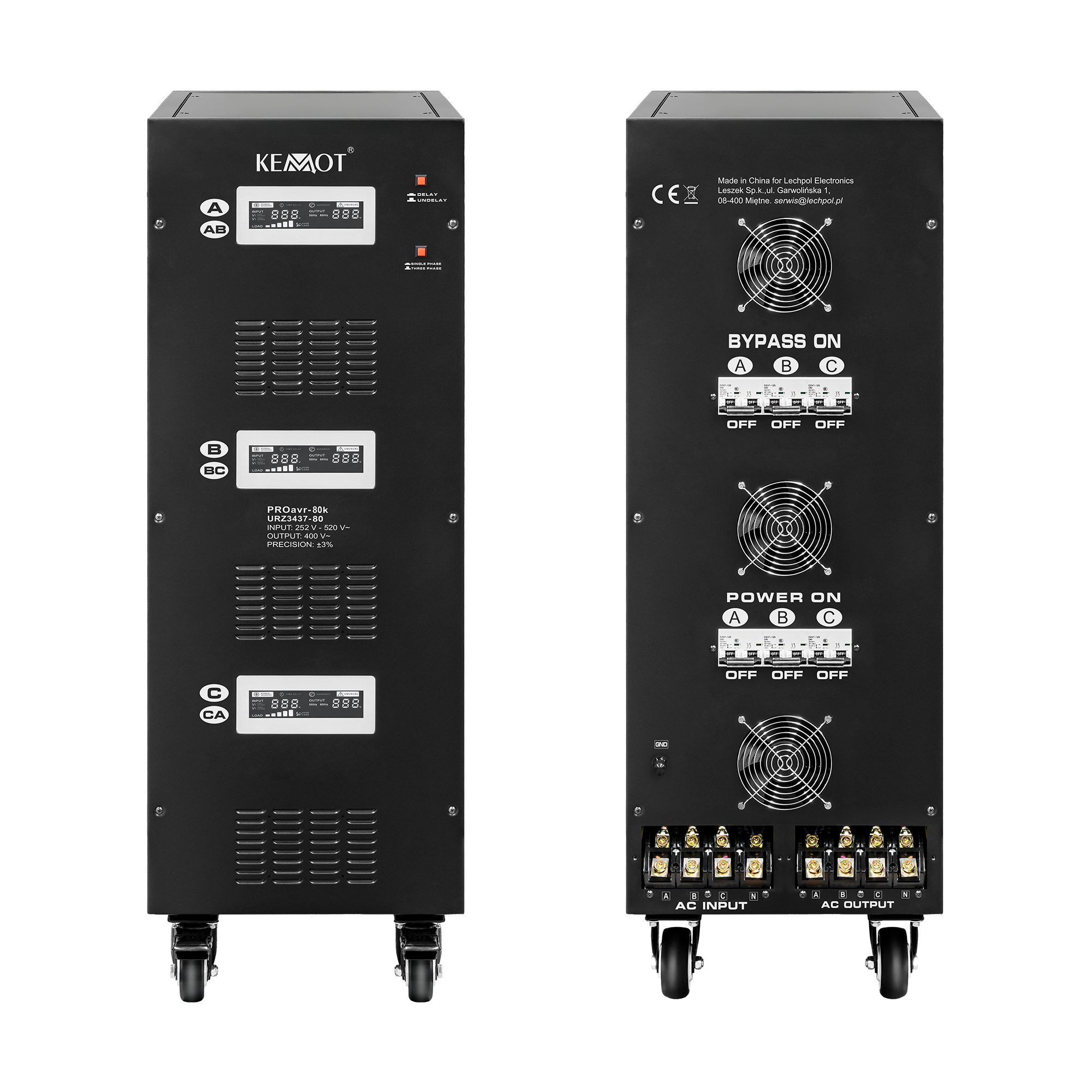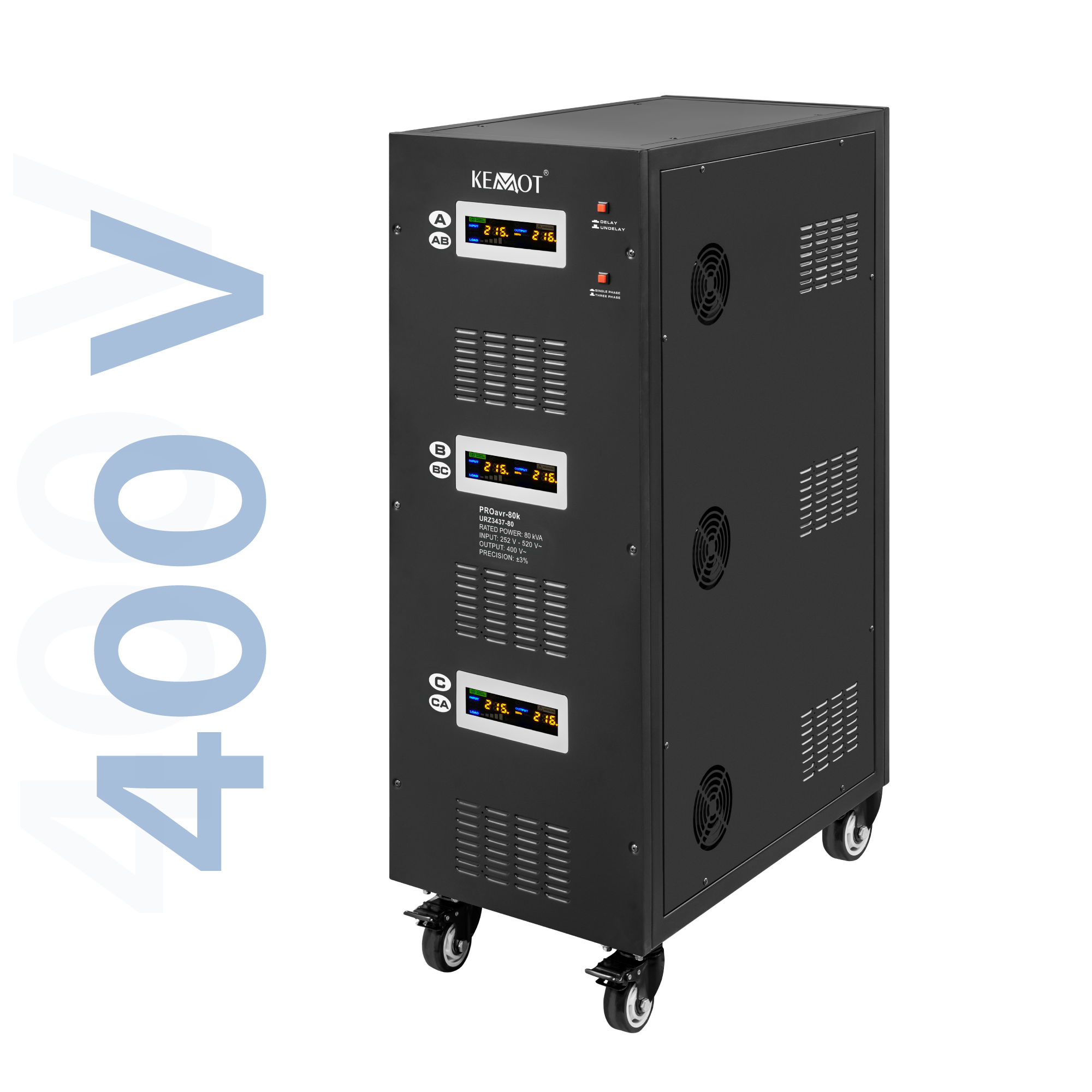 In modul monofazat, fiecare faza poate functiona independent una de cealalta. Indiferent de sarcina retelei si fluctuatiile tensiunii de iesire, stabilizatorul KEMOT PROavr-80k le mentine la 230 V ±3%, permitand functionarea eficienta a tuturor dispozitivelor, inclusiv a celor sensibile la calitatea tensiunii retelei. Reglarea este automata, asigurand o precizie ridicata a tensiunii de iesire. O eroare in functionarea uneia dintre faze nu afecteaza functionarea celorlalte.